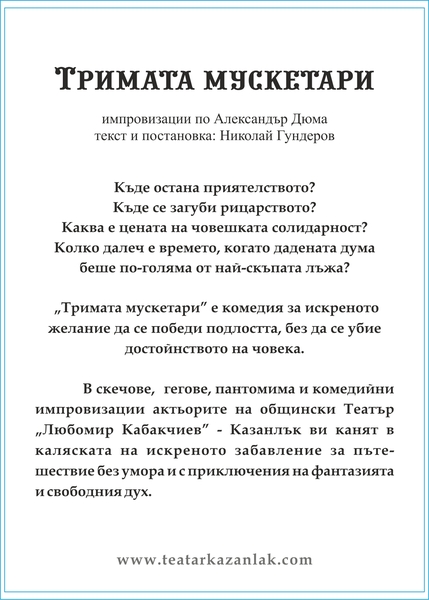 "Тримата мускетари" е комедия за искреното желание да се победи подлостта, без да се убие достойноството на човека.
